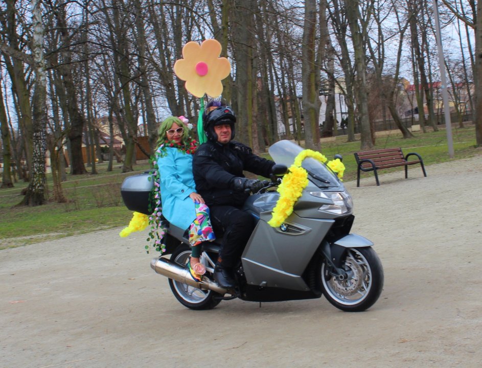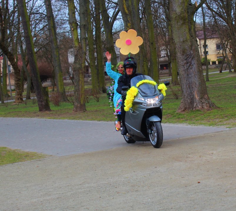 Nie zabrakło też niespodzianki… Pani Wiosna wjechała do parku na skuterze!