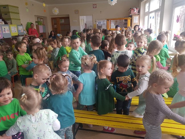 Tego dnia przedszkolaki ubrane były w różne odcienie zieleni, a ich głowy zdobiły szalone fryzury. Wszystkie grupy zebrały się w mini teatrzyku przedszkolnym by obejrzeć spektakl pod tytułem" Przybądź Wiosno". Przedstawienie zostało przygotowane i wystawione przez nauczycielki z Bajkowego Przedszkola. Dzieci uczestniczyły w spektaklu z dużym zainteresowaniem nagradzając aktorów gromkimi brawami. Kolejnym punktem powitania wiosny było puszczanie na boisku przedszkolnym wcześniej przygotowanych papierowych" rotocopterów". Przedszkolaki wspólnie zatańczyły radosny taniec" Wiosenne despacito". Tego dnia towarzyszył wszystkim radosny nastrój a na twarzach gościł promienny uśmiech.