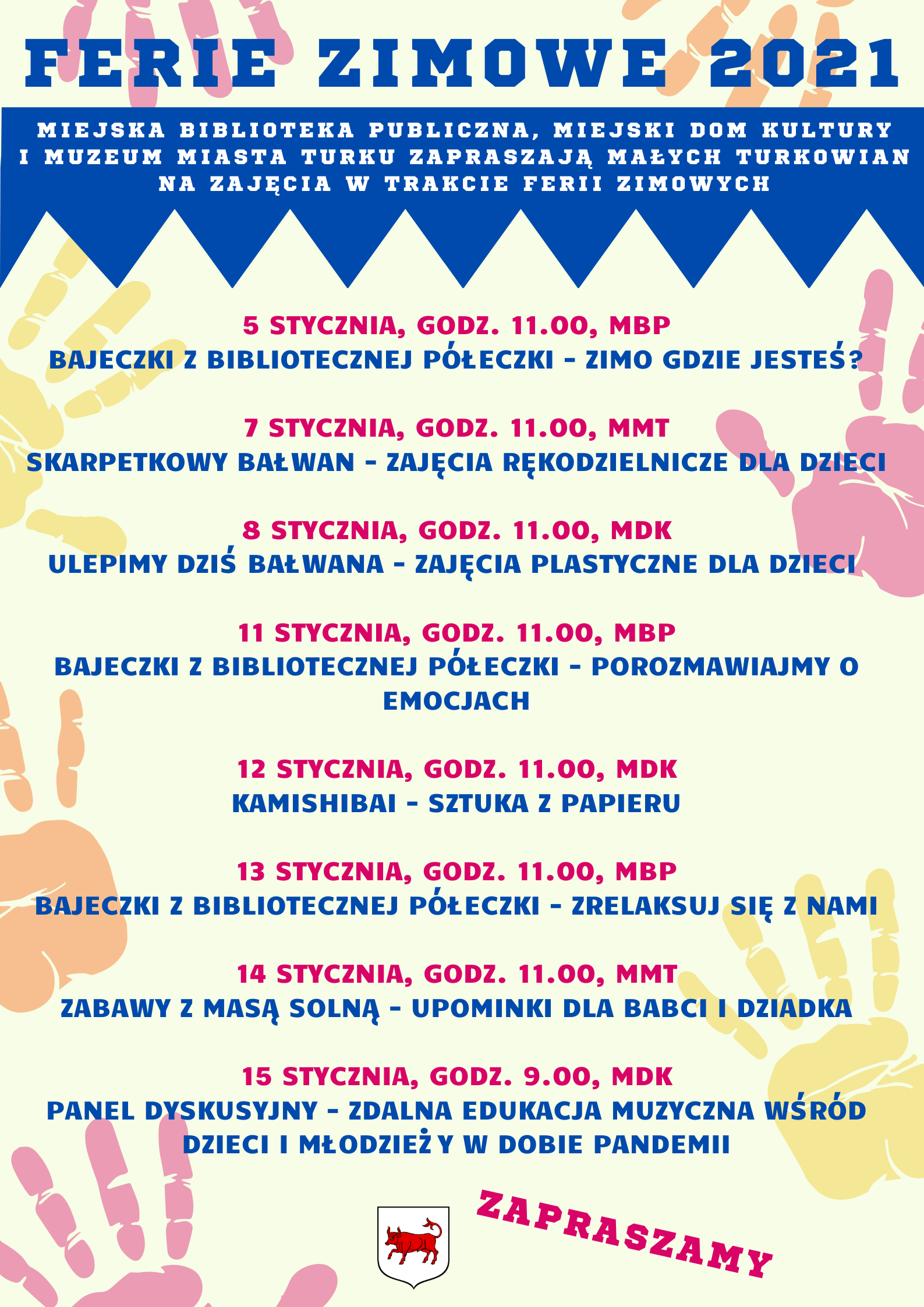 Miejski Dom Kultury, Miejska Biblioteka Publiczna i Muzeum Miasta Turku zapraszają dzieci mieszkające w Turku, na zajęcia w ramach ferii zimowych 2021.
