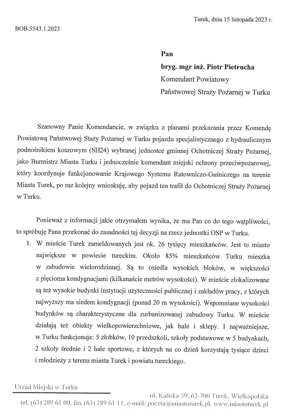 Niżej treść pisma Burmistrza Miasta Turku do Komendanta Powiatowego PSP w Turku, Komendanta Wojewódzkiego w Poznaniu i Komendanta Głównego PSP w Warszawie oraz do wszystkich posłów na Sejm RP z okręgu nr 37.