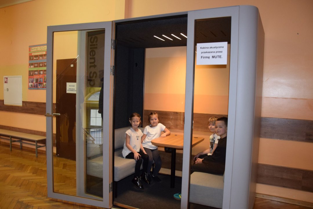 To wyjątkowe rozwiązanie stworzone z myślą o uczniach, którzy potrzebują chwilowego wyciszenia, koncentracji lub odpoczynku od nadmiaru bodźców, zapewniające nie tylko ciszę i spokój, ale także pełną poufność. Kabina wyciszająca to niewielkie, izolowane akustycznie pomieszczenie, które można wykorzystać do wielu celów. Jest to strefa dla nauczycieli – do pracy i różnorodnych spotkań z uczniami oraz rodzicami, do przeprowadzania indywidualnych zajęć z uczniami. Pozyskanie kabiny było możliwe dzięki owocnej współpracy szkoły i rodziców uczniów z firmą MUTE, która z pełnym zaangażowaniem odpowiedziała na potrzeby społeczności szkolnej.